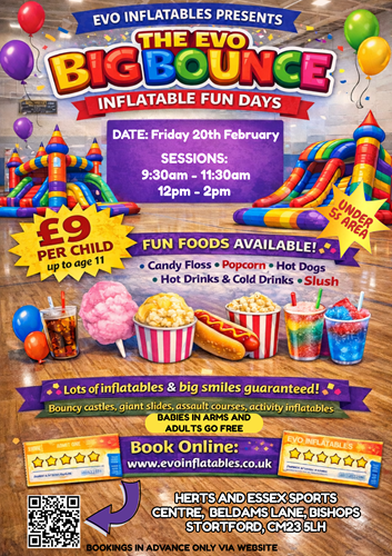 To all our customers old and new, we thank you for your business throughout the years and we wish you a Happy New Year - Evo are very excited about 2026 and we hope you are too! We provide bouncy fun at schools, festivals, corporate events, in gardens, halls and even at weddings. Plus we hold our own Evo Bounce Days throughout the year either indoors or outside at locations around Essex and Hertfordshire. Our ever popular indoor bounce days are now on sale for February Halterm and will be taking place at a venue near you in Essex and Hertfordshire. Tickets must be purchased in advance at indoor events - just click on the flyers below to take you through to the different events. New venues will be posted soon! Watch this space!