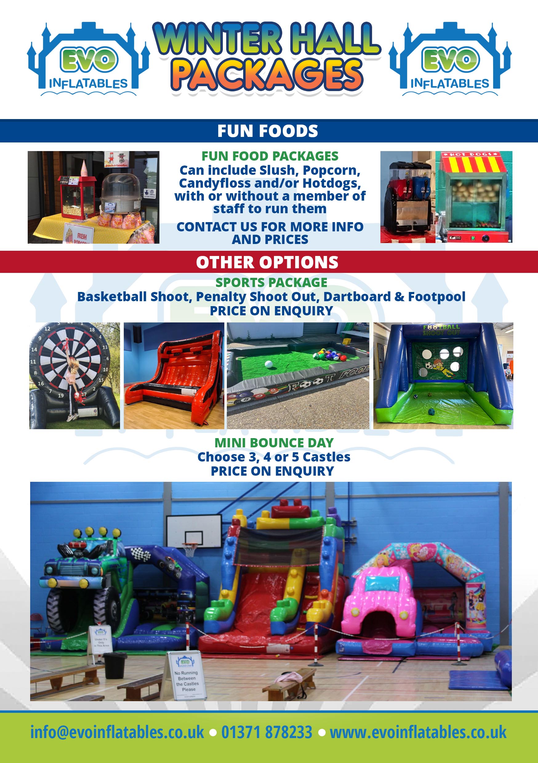 If you are a looking for a bouncy castle for a party in your garden this Winter then please click here to book for a private party, there is a limited selection of inflatables that we allow outside. If you want to book a venue or a hall then please take a look at a lot of the places that we work at our on Venues Page! Plus Party Packages - a great idea to book everything under one roof - your one stop party shop! Have a look at the flyers below for ideas or give us a call on 01371 878233 to find out more or enquire here on our Contact Us Form.