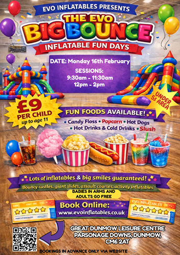 To all our customers old and new, we thank you for your business throughout the years and we wish you a Happy New Year - Evo are very excited about 2026 and we hope you are too! We provide bouncy fun at schools, festivals, corporate events, in gardens, halls and even at weddings. Plus we hold our own Evo Bounce Days throughout the year either indoors or outside at locations around Essex and Hertfordshire. Our ever popular indoor bounce days are now on sale for February Halterm and will be taking place at a venue near you in Essex and Hertfordshire. Tickets must be purchased in advance at indoor events - just click on the flyers below to take you through to the different events. New venues will be posted soon! Watch this space!
