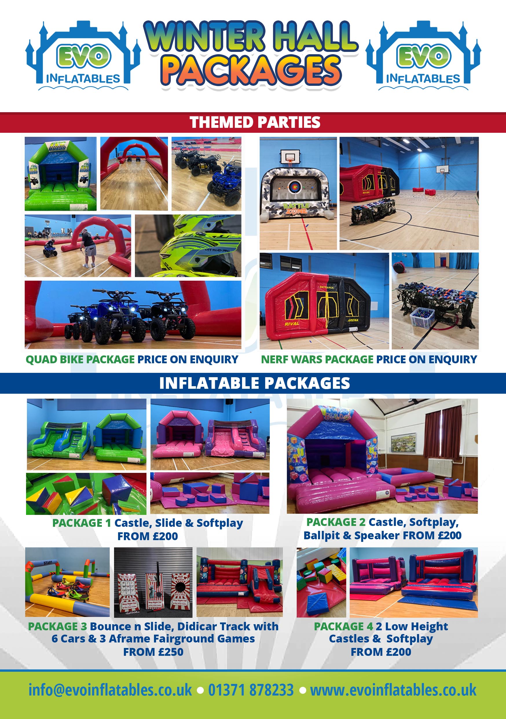 If you are a looking for a bouncy castle for a party in your garden this Winter then please click here to book for a private party, there is a limited selection of inflatables that we allow outside. If you want to book a venue or a hall then please take a look at a lot of the places that we work at our on Venues Page! Plus Party Packages - a great idea to book everything under one roof - your one stop party shop! Have a look at the flyers below for ideas or give us a call on 01371 878233 to find out more or enquire here on our Contact Us Form.