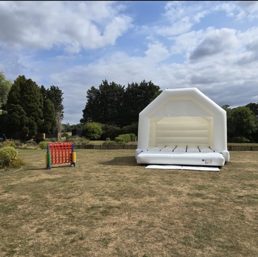 Our gorgeous white wedding castle and trained staff for 3 hours plus choose a mega 4 in a line or giant tumbling blocks for free! Just tell us in the notes which garden game you would like. Thank you.