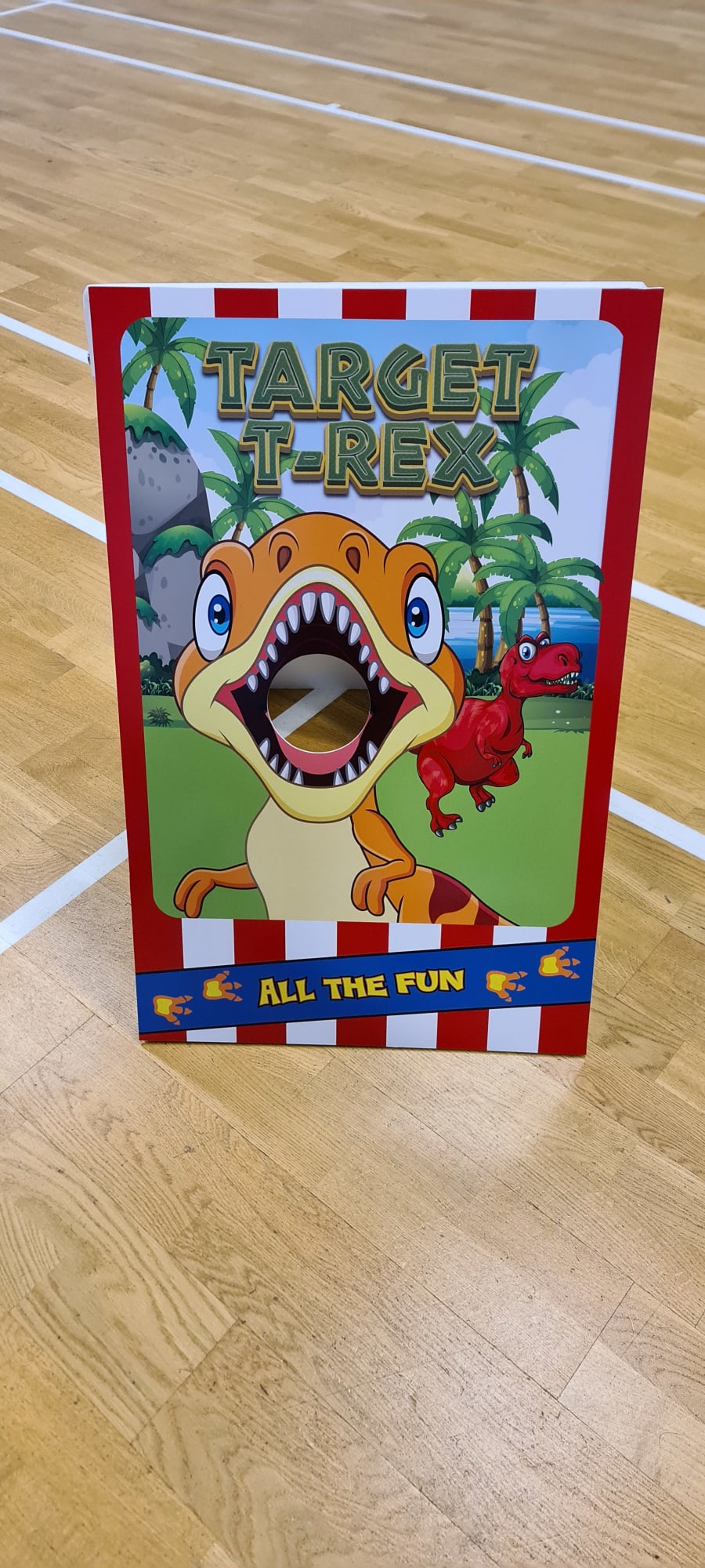 Traditional side stalls in a dinosaur theme - this one is to try get the balls or the beanbags in the T-Rex's mouth!