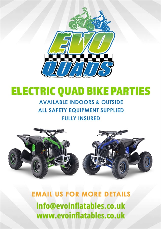Electric quad bikes - all bikes are electric and have restricted speed which we control Inflatable quad track Quad marshalls Safety equipment and briefing provided Fully insured 2 hour sessions Timed laps and medals - we do timed races with a trophy for the winner and every child gets several rides on the quads and a medal at the end We have a winners podium and trophy presentation for the winner 🏆 A bouncy castle for fun while kids not on quad bikes We have refreshments on sale and benches for parents to watch from £375 per party maximum 20 children at a party - these take place at our own private venue Note - any photos taken by our staff will be sent to you at end of party.