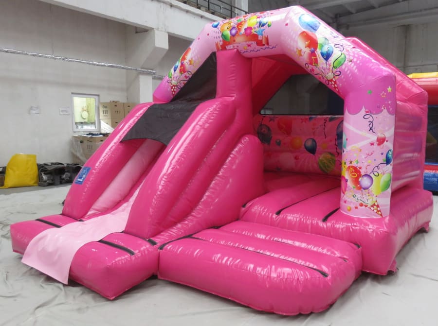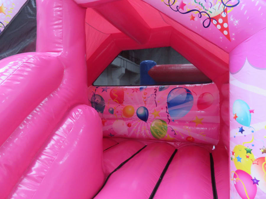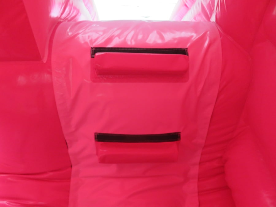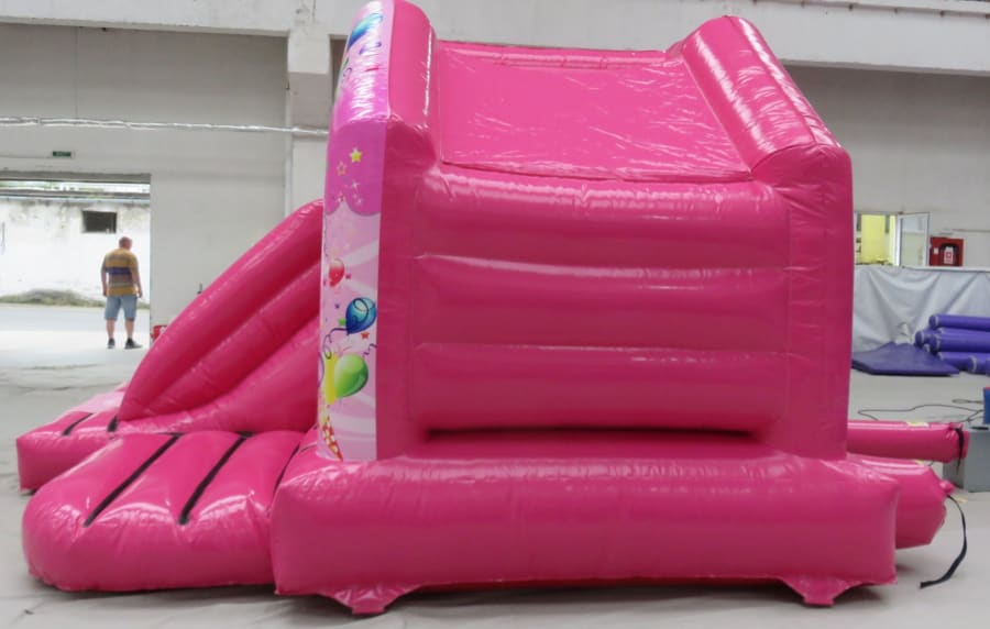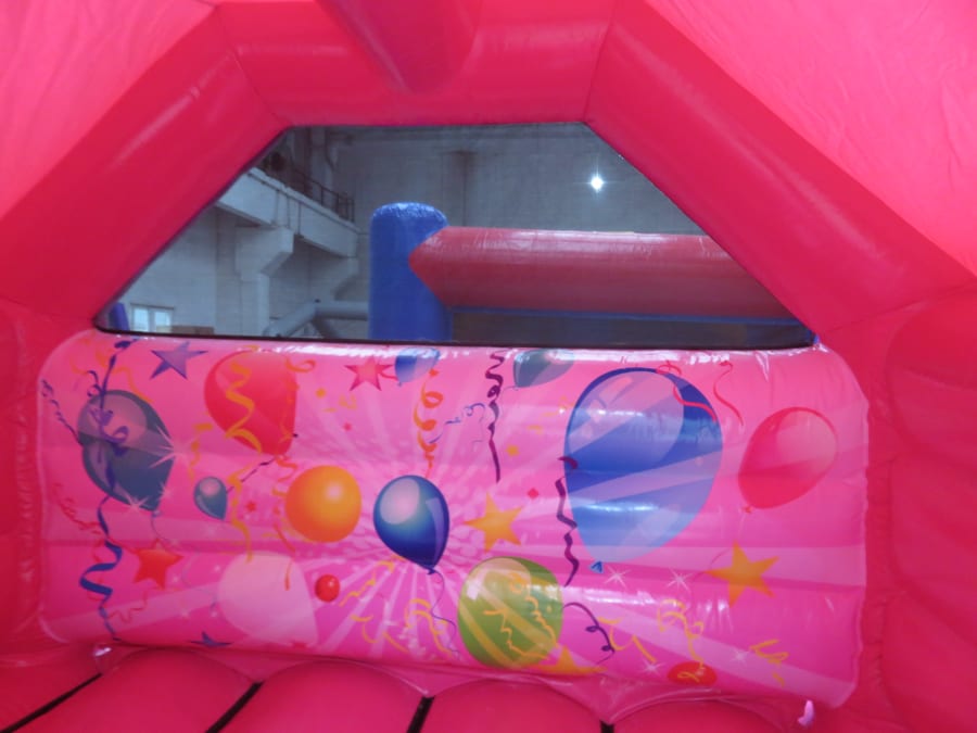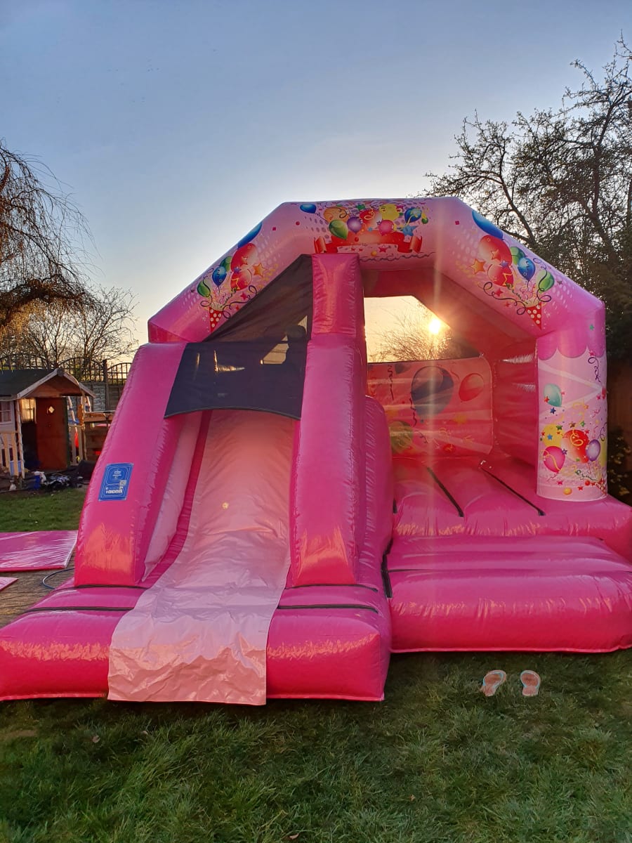 Think pink! Think Evo! Look at this glossy shiny pink bouncy castle with cute internal slide. This is perfect for children's birthday parties in the garden and with a roof cover it doesn't matter if there is a little rain in the air! Got a birthday coming up and not sure how to entertain your little one - this is your answer! Gorgeous party balloons on the castle print are sure to put a smile on their faces! Takes 6 children at a time under 1 m - see size details for more heights. Plus safety tested to PIPA standards as are all our castles. Perfect in gardens or halls. Comes with matching pink mats!