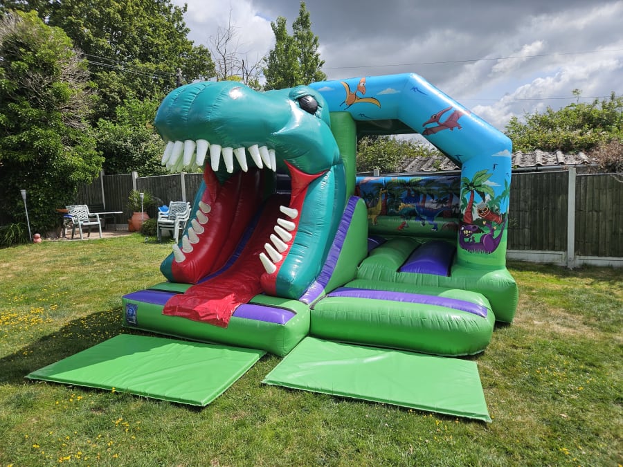 Welcome to Evo Inflatables, the leading provider of bouncy castle hire and other entertainment in the whole of Essex! Our Dino Front Slide Bouncy Castle brings a standard bouncy castle to life. This superbly decorated Dino has a very attractive mouth as the slide exit. Our dinosaur Bouncy Castle with front slide is a wonderful addition to our choice of inflatables.