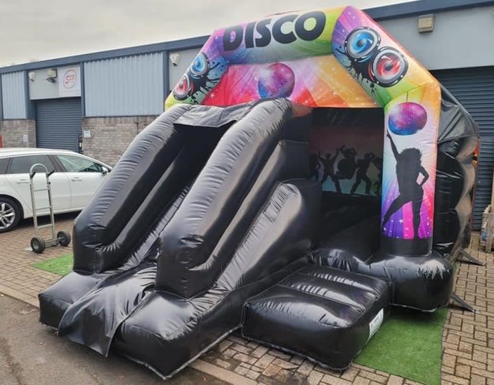 Brand new to the fleet, our disco ready front slide bouncy castle combination. Comes with a built in disco light and bluetooth speaker, just connect your phone or tablet and bounce the day away in time to your favourite tunes!