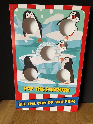 You get a cute rubber penguin popper and soft balls that you put inside the penguin's mouth and then try and shoot out into the holes onthe board - Christmassy/wintry theme - great for school fetes, winter weddings and garden parties alike.
