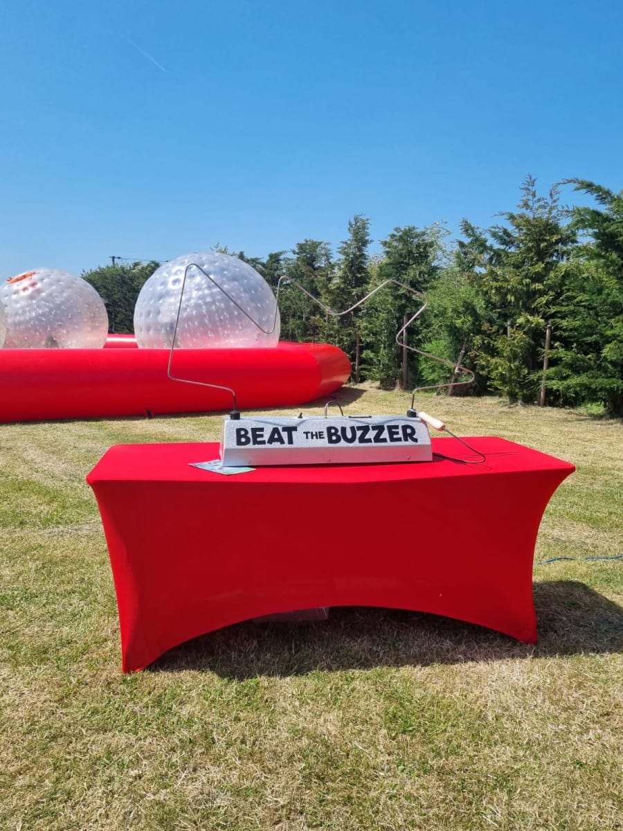 Tabletop version of the side stall Buzzwire or Beat the Bleep - have it in your lounge or garden for a party with a bleep (or not)! Still a good size and can be on the floor for little kids or on a table for bigger kids and adults. Comes with a table and cover.