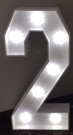 4ft '2' Light up number, handcrafted in white wood with white led bulbs. Great additional venue décor for your wedding or event. This letter is a great for initials or names.