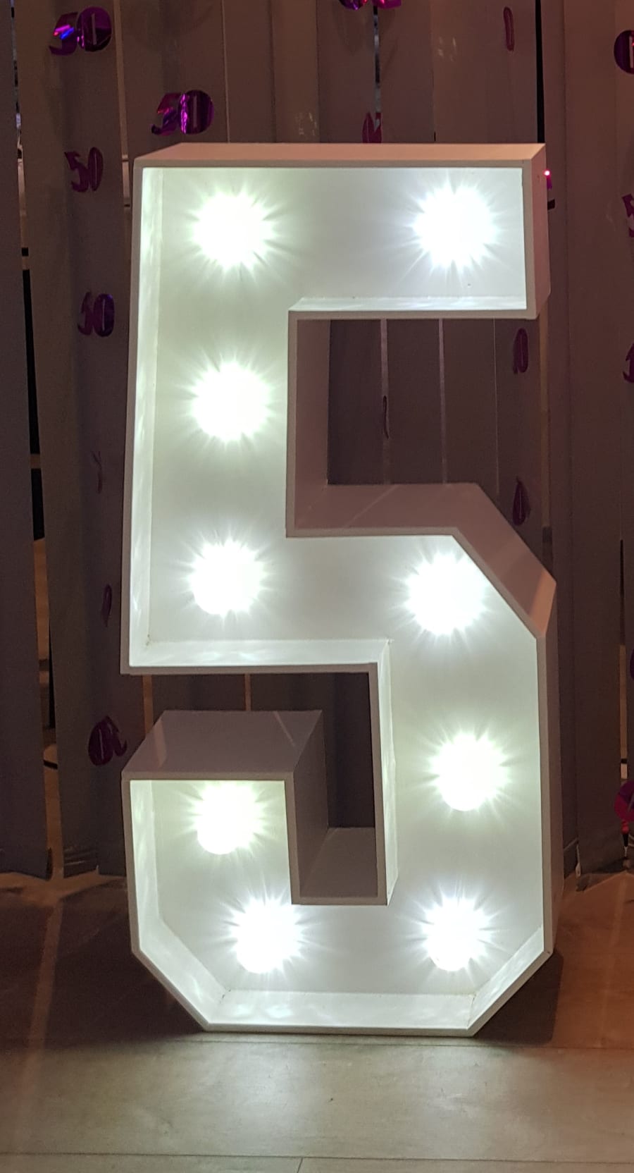 4ft '5' Light up number, handcrafted in white wood with white led bulbs. Great additional venue décor for your wedding or event. This letter is a great for initials or names.