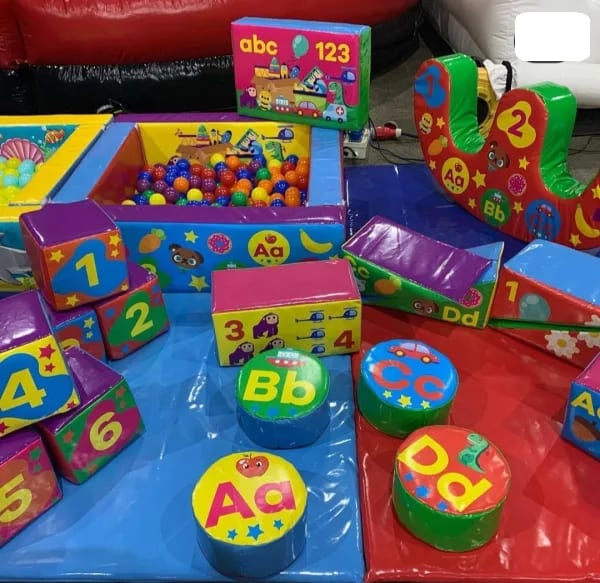 15 pieces of soft play including a 2 person rocker and three mats in gorgous abc/123 theme. Plus you get a ballpit too. And two animal bouncers!