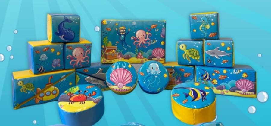 17 pieces of soft play inc three mats in gorgous under the sea/pirate theme with fab two person rocker and jelly bean. You can add a ballpit and we even have a castle if your hall is big enough for the older ones. These come at extra charge. See other items in the Under the Sea/Pirate category for prices.