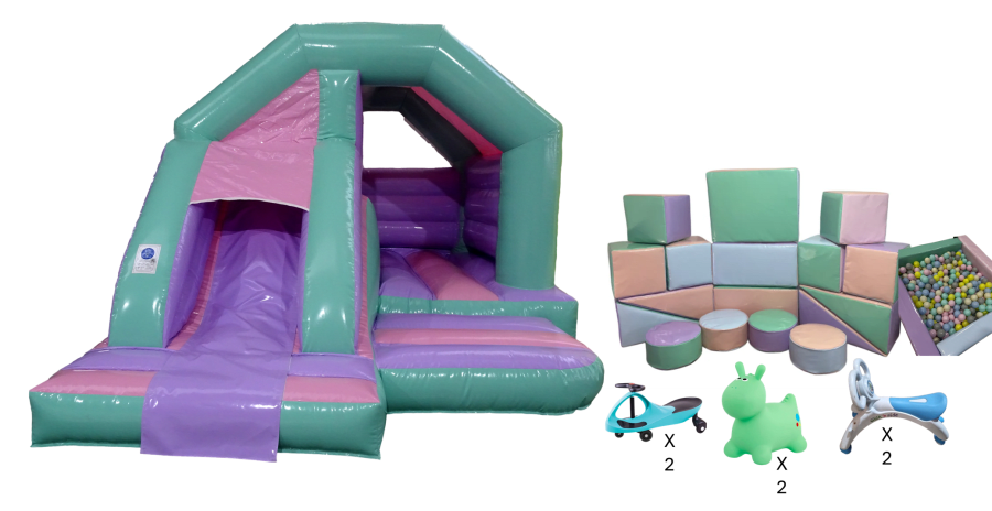 The package includes the bouncy castle with front slide combo, a set of mini pastel soft play and a beautfiful ballpit filled with pastel balls PLUS you also get two trikes, two didicars and two animal bouncers to make the package premium pastel!!