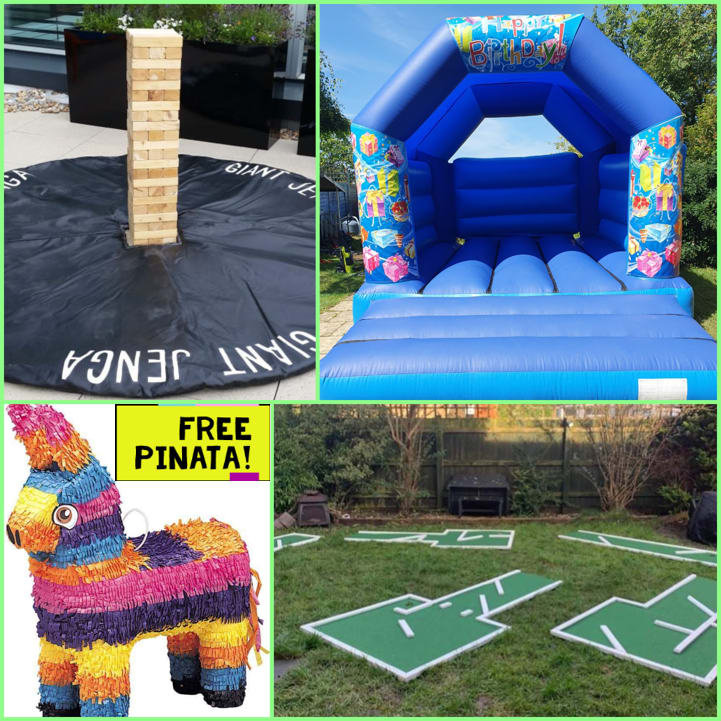 Fabulous Boys Birthday Party Package - perfect for household back garden parties. Comes with a Happy Birthday bouncy castle (other themes can be chosen), a giant tumbling tower with mat, and a 9 hole mini golf course with various sizes of golf clubs, balls, scorecards and pencils. Plus free pinata with every package.