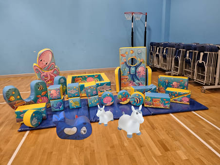 17 pieces of the mini soft play plus a 2 person rocker and a jelly bean plus two animal bouncers and mats in this gorgeous under the sea theme. Plus you get a ballpit and themed snakes & ladders game too.